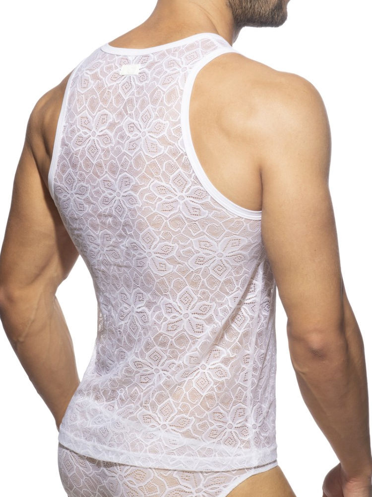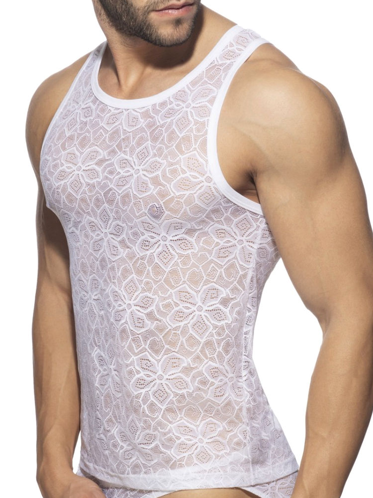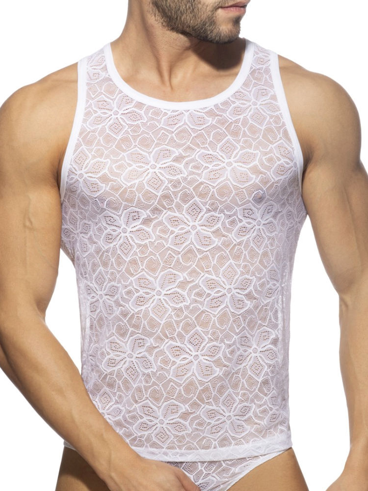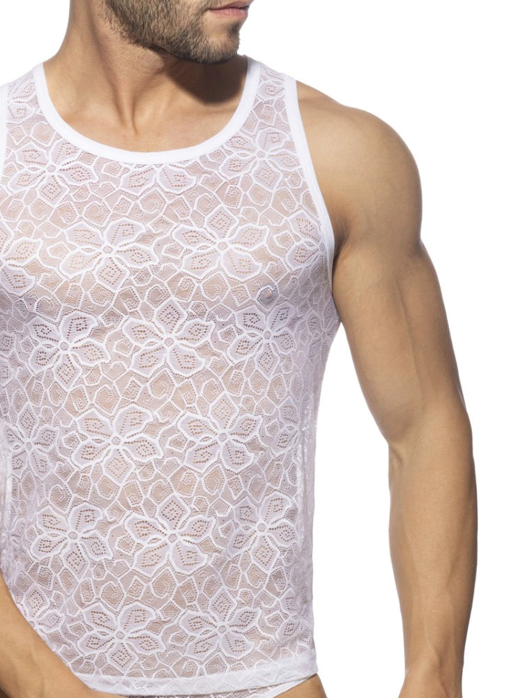 Gemaakt van de meest fijne bewerkte stoffen en kant, met een moderne look en sensuele feel; ontdek de Addicted Flowery Lace collectie van luxe kant voor mannen. Een rijkelijk bewerkte singlet voor mannen van een zachte, fijne rijkelijk bewerkte witte kant. Deze comfortabele tank top met aangesloten pasvorm laat de contouren van jouw lichaam optimaal tot hun recht komen. Ervaar het stoere en verleidelijke gevoel tijdens het dragen en laat zien wat je in huis hebt met deze uitdagende en uitermate opvallende witte kanten tank top van Addicted. Alleen voor echte luxe liefhebbers…