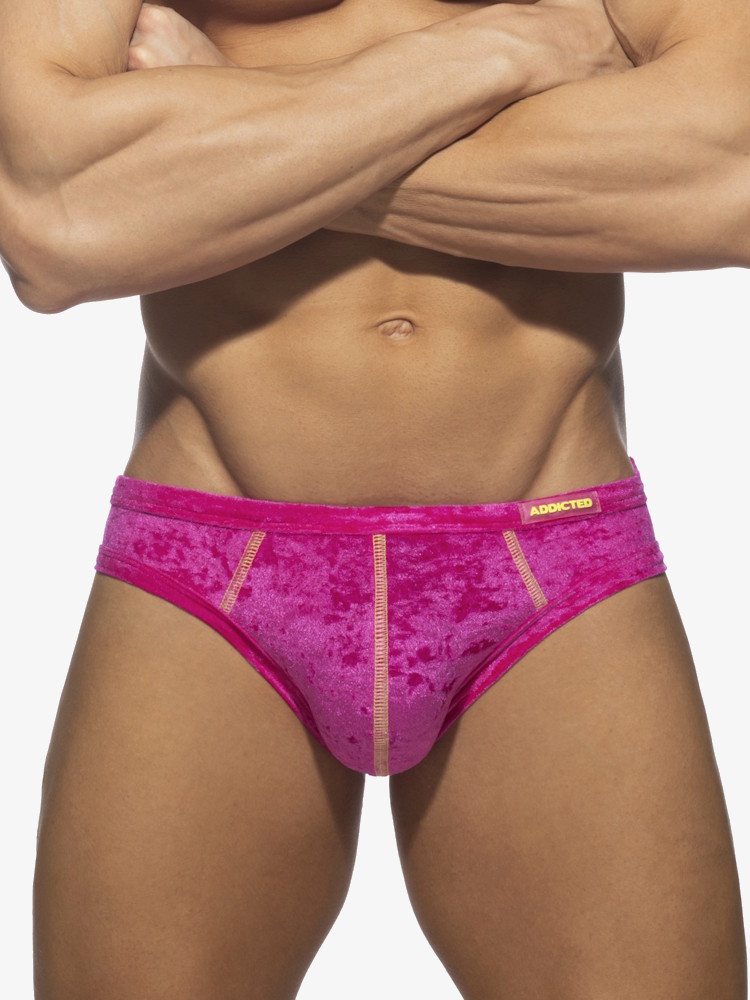 Zacht om te zien en zacht om te voelen. De Addicted AD1208 Velvet Shady Bikini Brief Fuchsia is een comfortabele heupslip met hoge aaibaarheidsfactor. Vanwege de fluweelzachte structuur krijgt deze fuchsiaroze Addicted slip bij iedere aanraking een andere look. Verander jezelf in een stoere, knuffelbare vent met deze coole roze Addicted onderbroek.