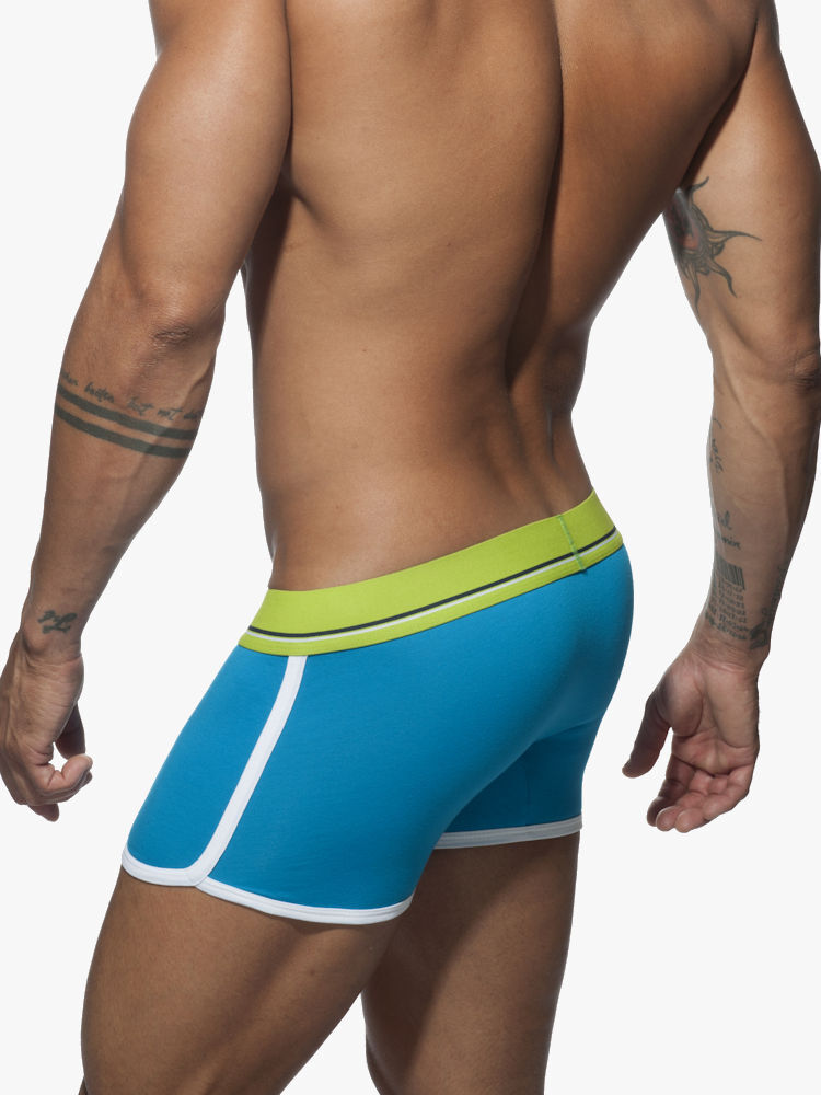 De strakke belijning met rondingen aan de voor- en achterkant zorgt voor een dynamische en stijlvolle look. Een boxershort met langere pijpjes en een pouch die zorgt voor ondersteuning en een liftend effect. De contrasterend bies, tailleband en split aan de zijkant geven de short zijn uitermate sportieve karakter. Ervaar zelf het comfort van deze katoenen Addicted boxershort in blauw met wit en groen en creëer de perfecte basis voor een sportieve en casual outfit. Addicted: Designed and made in Barcelona!