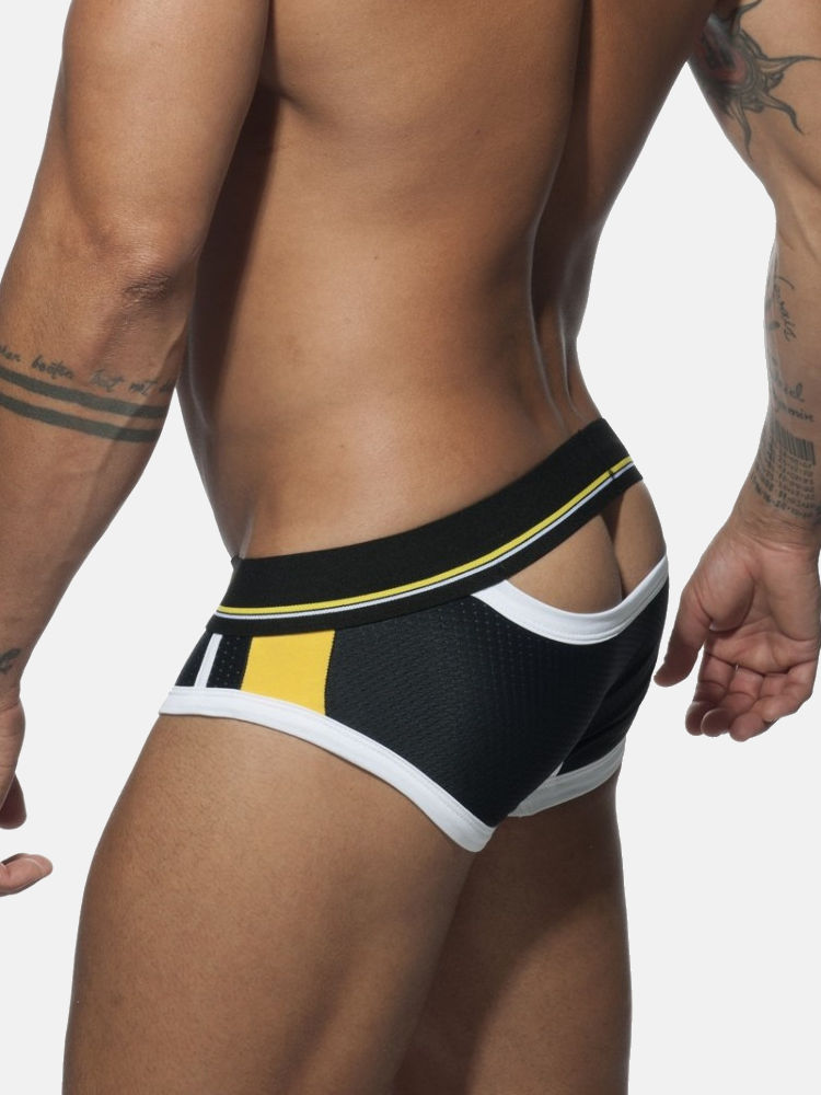 De Addicted AD740 Open Sport Mesh Brief is gemaakt van een fijne geperforeerde stof en afgewerkt met een elastische tailleband met logo. De pouch biedt goede ondersteuning tijdens het dragen en zorgt voor een liftend effect. Aan de achterzijde boven de billen deels open waardoor een uitdagende look ontstaat. Uitgevoerd in zwart met witte bies en sportieve accenten in geel. Voeg stijl en comfort toe aan je garderobe met deze coole en sportieve Addicted onderbroek.