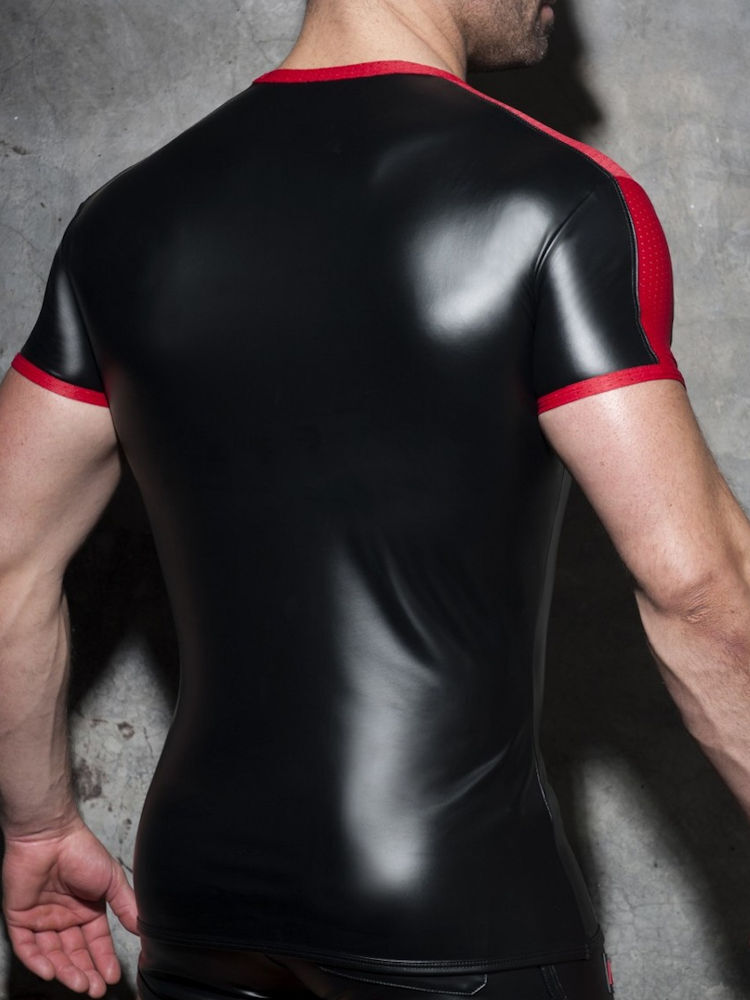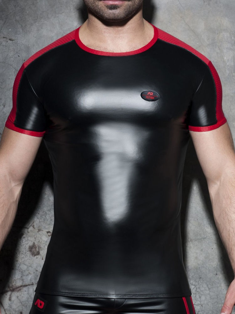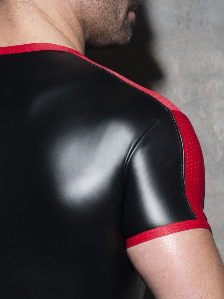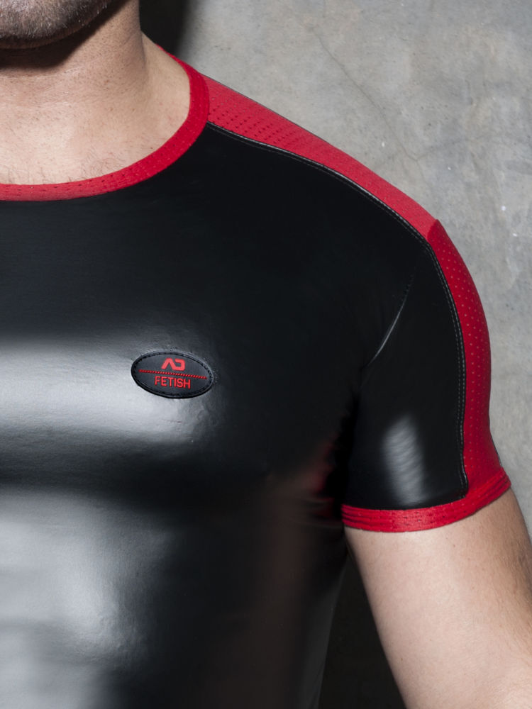 Addicted Fetish ADF117 rub mesh t-shirt van zwarte stretch met rode mesh