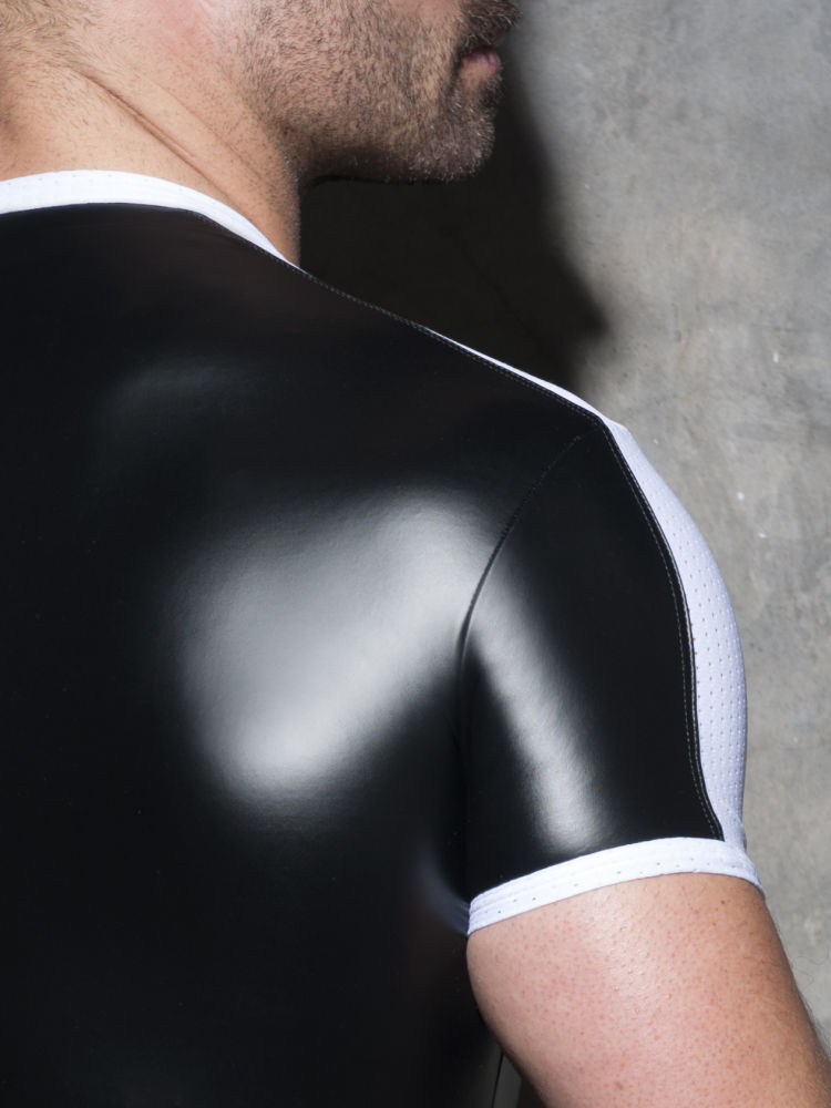 Of je nu kiest voor een short, harnas of t-shirt, alle items zijn absolute eyecatchers en must-haves voor de fetish underwear liefhebber! Addicted combineert vernieuwende ontwerpen, stijl en sensualiteit in deze stoere serie met gewaagde fetisj look. Het dunne soepele shirt sluit perfect aan op het lichaam en heeft mooi aansluitende mouwtjes die de armen extra goed doen uitkomen. Met de witte mesh inzet bij de schouders kun jij laten zien waar je voor staat, én gaat! Eenvoudig schoon te maken. Met dit shirt hoef je geen moeite te doen om er stoer en legendarisch uit te zien. Het perfecte shirt voor een avond uit, of voor een spannend en wild avontuur!