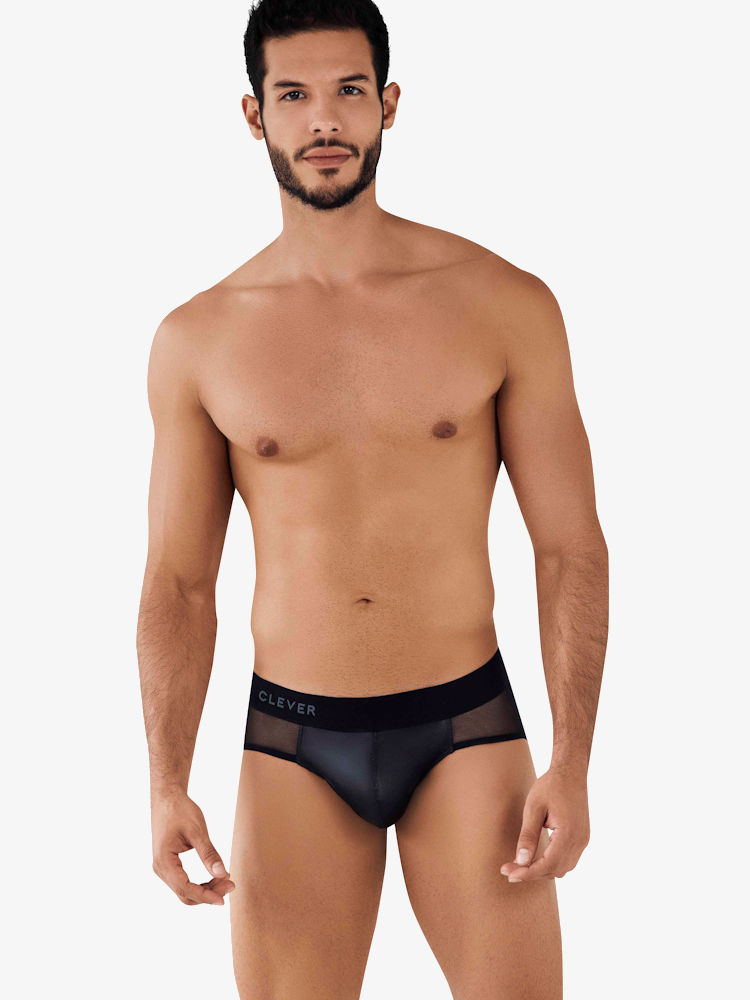 Een stoere slip voor mannen met moderne pasvorm; laag gesneden bij de buik en voorzien van een pouch die zorgt voor een groter ogend profiel. Uitgevoerd in zwarte fijne netstof met gesloten kruis van glimmende stretch. Deze uitdagende zwarte Clever Underwear slip voor mannen is de perfecte basis voor een geslaagde, stijlvolle outfit die je al bij het aantrekken een gevoel van sensatie zal geven. Een must-have voor iedere Clever slips fan!