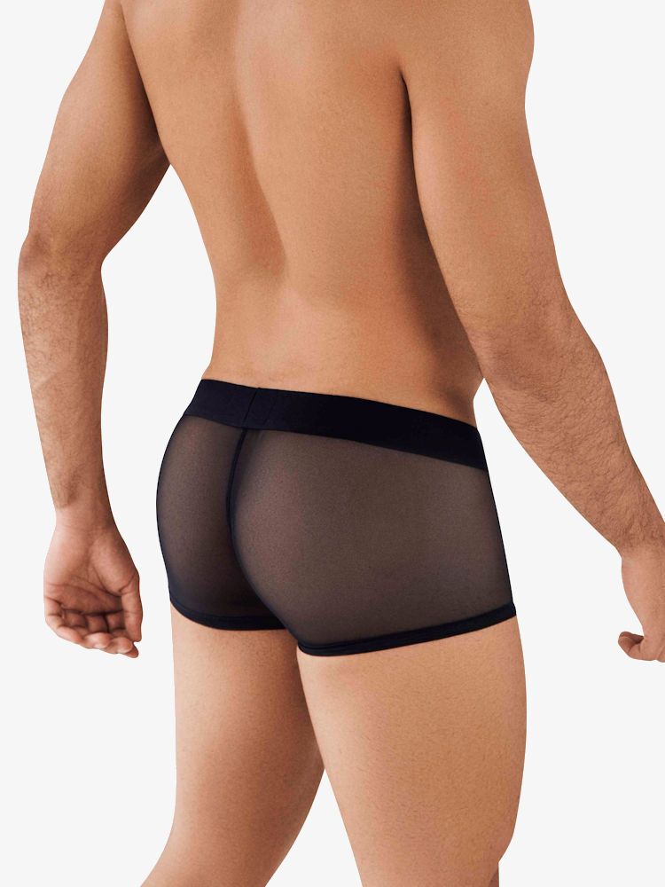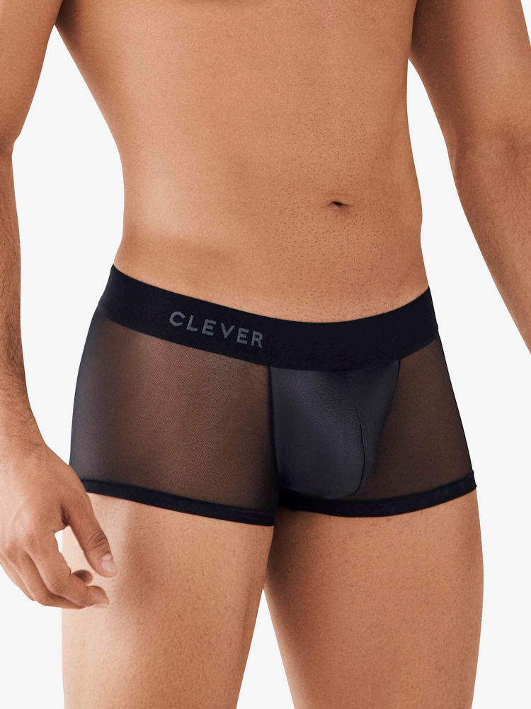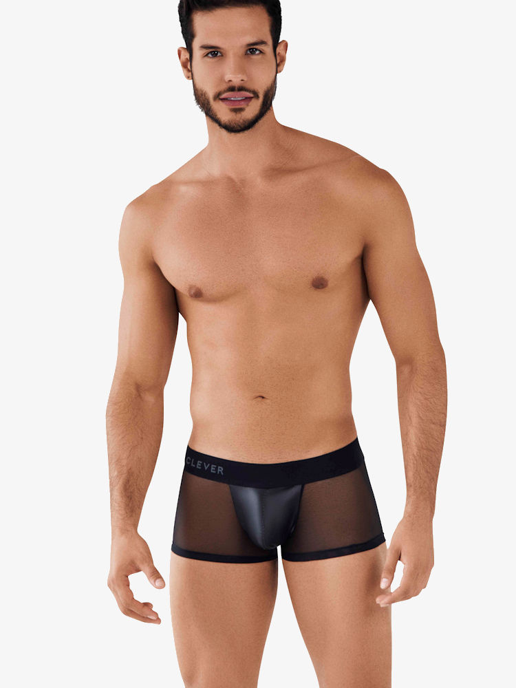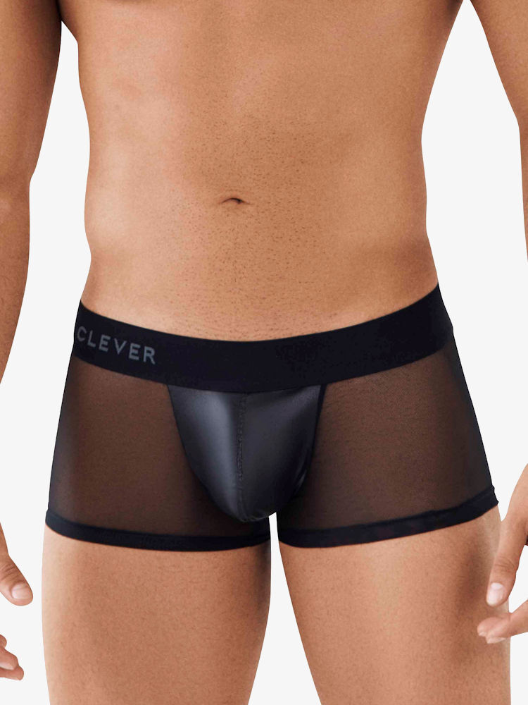 Een stoere korte strakke boxer met moderne pasvorm; laag gesneden bij de buik en voorzien van een pouch die zorgt voor een groter ogend profiel. Uitgevoerd in zwarte fijne netstof met gesloten kruis van glimmende stretch. Deze uitdagende zwarte Clever Underwear boxershort voor mannen is de perfecte basis voor een geslaagde, stijlvolle outfit die je al bij het aantrekken een gevoel van sensatie zal geven. Een must-have voor iedere Clever underwear fan!