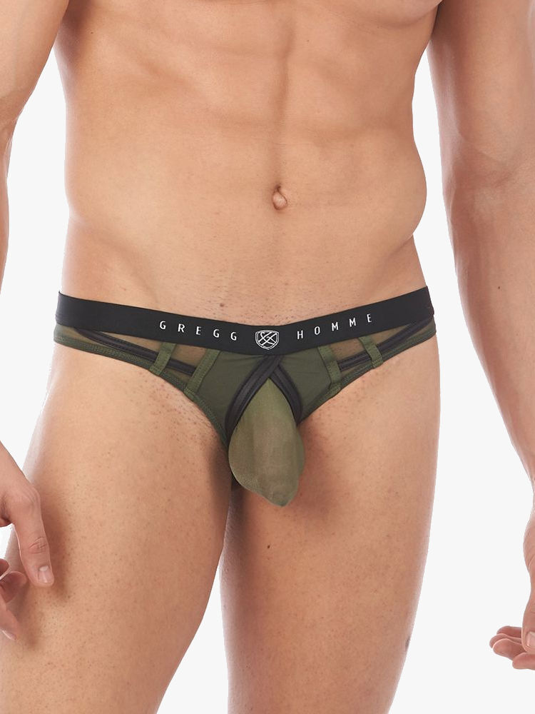 Gregg Homme Erupt Thong 140004 string van kaki groene mesh met omzoomde push-up pouch