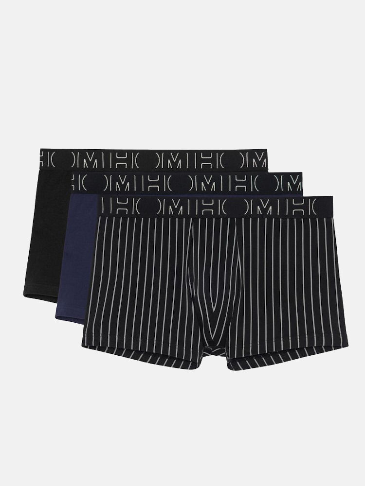 Een voordelige set bestaande uit 3 heren boxershorts in uni koningsblauw, uni zwart en één in zwart met verticaal streepdessin. De korte boxershorts zijn gemaakt van een zachte, comfortabele katoen-stretch kwaliteit die garant staat voor draagplezier. Afgezet met elastische tailleband met HOM logo. Met deze eenvoudige maar tevens stijlvolle boxershorts creëer je de perfecte basis voor een geslaagde outfit.