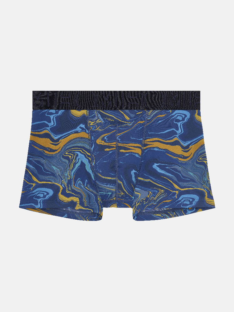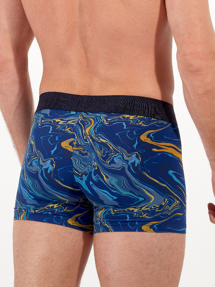 Ontdek de Hom Funky Styles collectie. Met de hoogwaardige kwaliteit en moderne pasvorm die je van Hom gewend bent, maar dan nét iets funkier! Voeg kleur, stijl en comfort toe aan je garderobe met de Hom Funky Styles Boxer Briefs HO1 403045 Navy Ocher Print; een korte strakke boxershort met moderne vormgeving en horizontale gulp, gemaakt van soepele blauwe microfiber met marmerprint in oker.