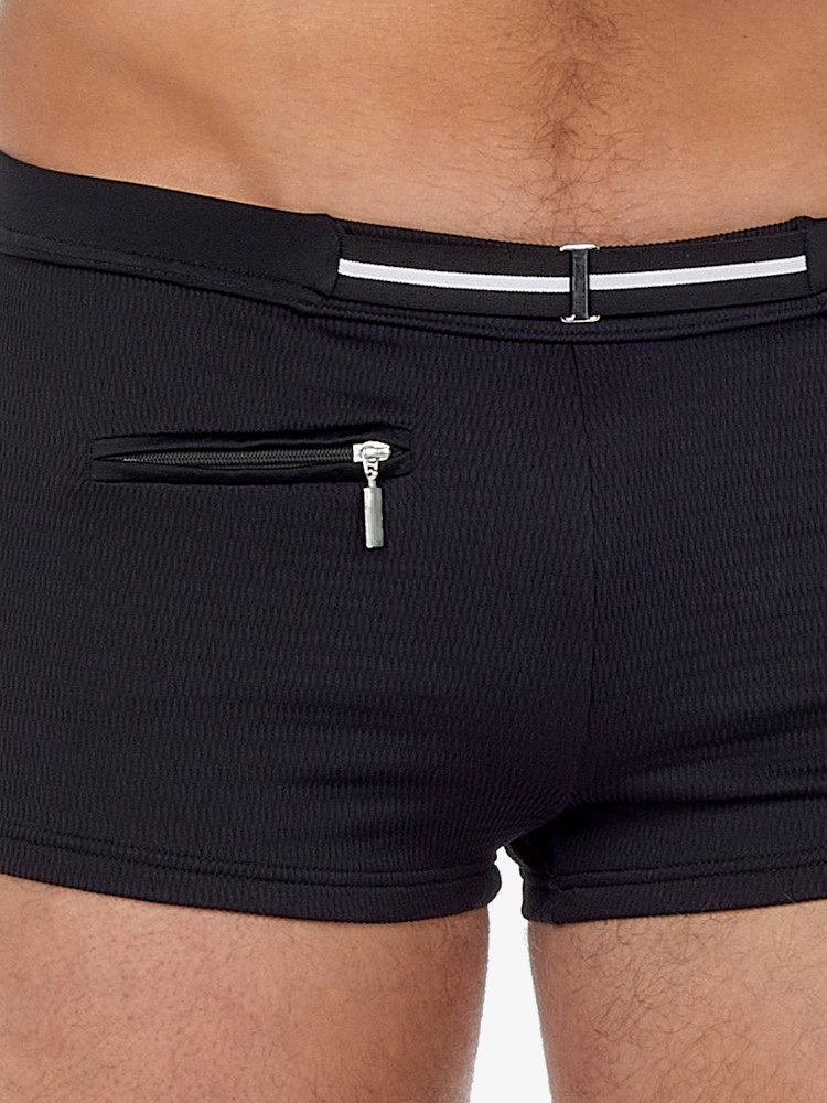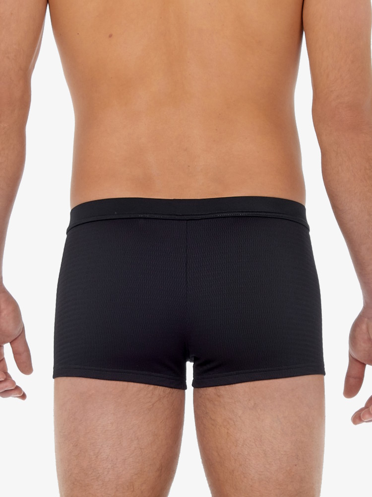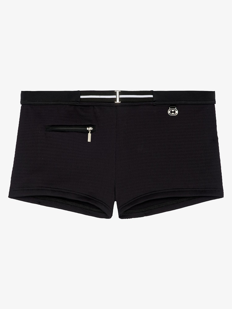 De Hom Harold Swim Shorts Black combineert op eenvoudige wijze comfort met een moderne en stijlvolle look. Maak kennis met deze korte strakke zwemshort met siersluiting, zakje met ritsluiting en fijne reliëfstructuur. Stijlvol, stoer, met een knipoog naar het verleden.