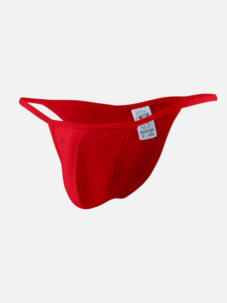 Is het een string, is het een bikini slip? Nee, het is de Joe Snyder Kini JS12 Shining Red! Een slip met smalle achterkant en taillebandjes in glimmende fel rode stretch.