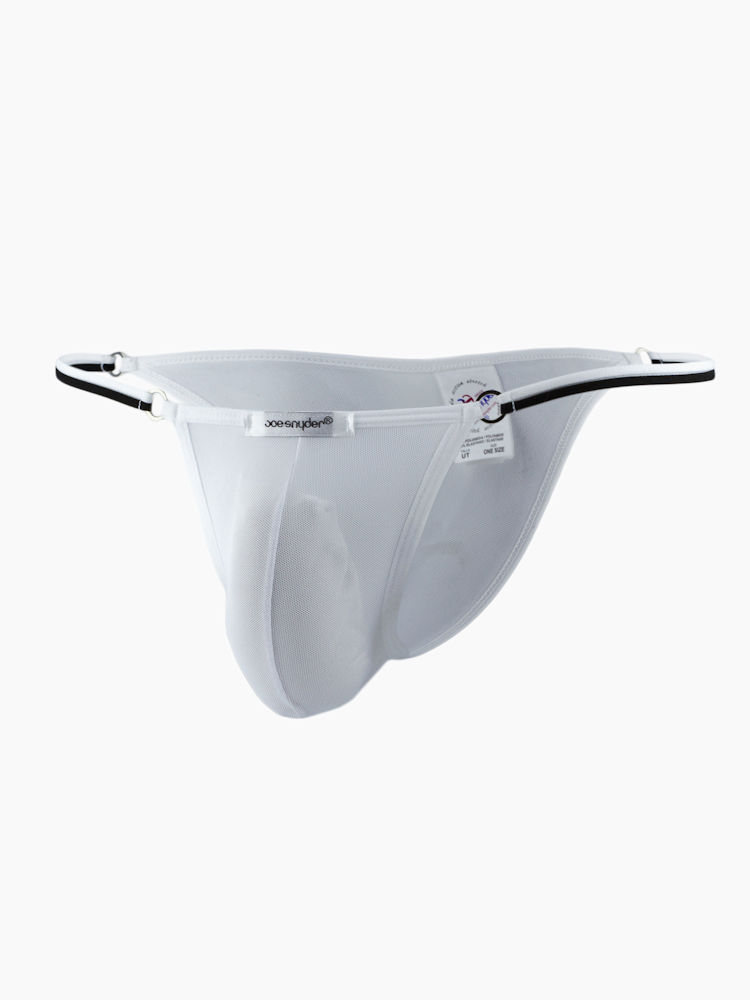 Gemaakt van een zachte doorschijnende fijne witte mesh en bij de heupen voorzien van dubbele smalle bandjes. Smal gesneden bij het kruis en klein bij de billen. Speciaal ontworpen voor de man die het prettig vindt weinig onder zijn kleding te dragen, maar wel perfecte ondersteuning wenst. Ben jij op zoek naar kleine slips? Bekijk dan snek deze Joe Snyder Kinny bikini, als je durft…
