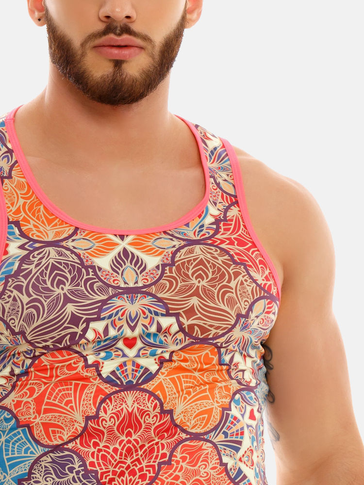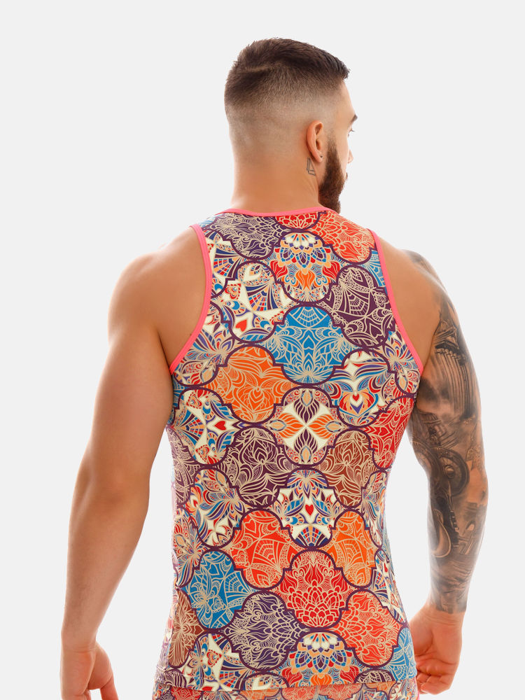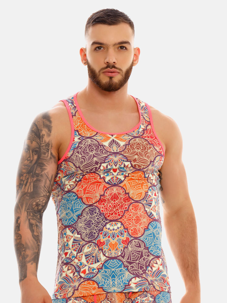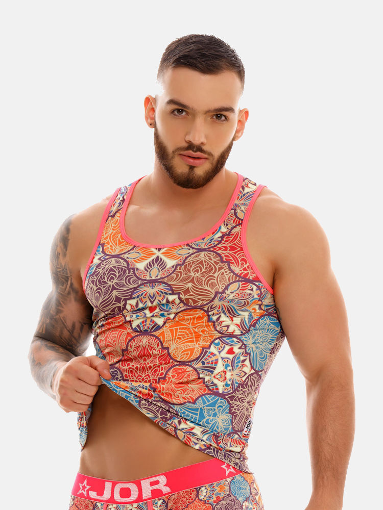 De nieuwe JOR Underwear Cairo serie is gemaakt van een zachte, soepele stretch kwaliteit en daardoor een plezier om te voelen en een genot om te dragen. Uitgevoerd met een all-over print die is gebaseerd op oude Oosterse mozaïeken voor een vrolijke en stijlvolle look. Kies jouw favoriet uit de fel gekleurde stijlen en maak je klaar voor een Oosters avontuur. Dit mouwloze shirt met dessin geeft jouw positieve gevoel zeker een boost!