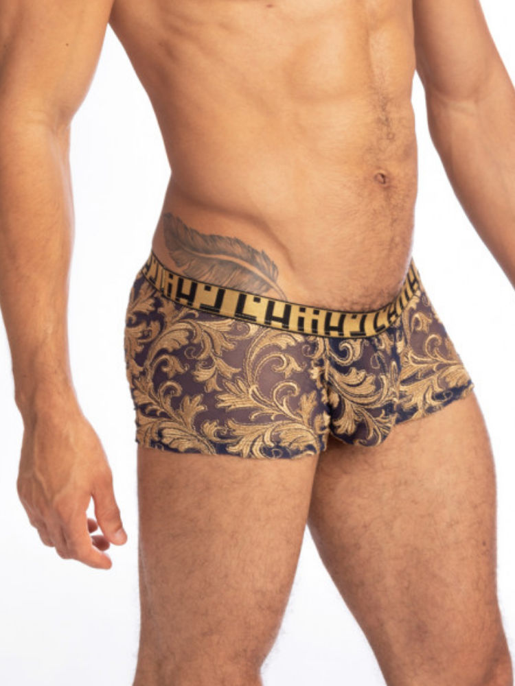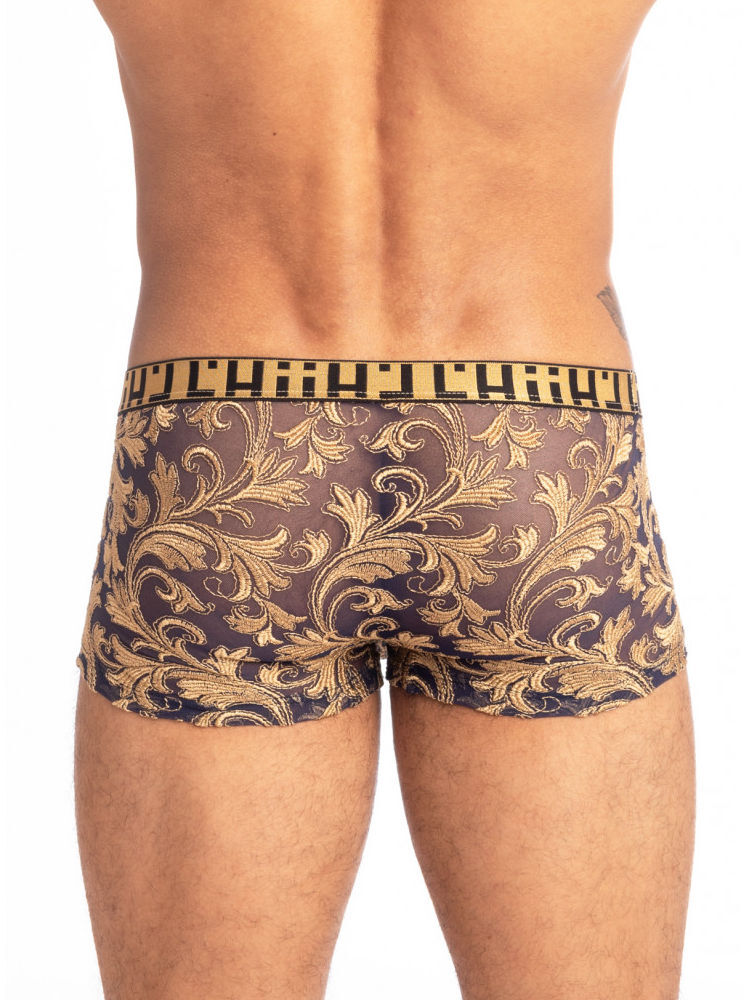 De nieuwe L’Homme Invisible Oppulence Assumé Hipster Push-Up is een boxershort uitgevoerd in marine met goud bewerkt kant.