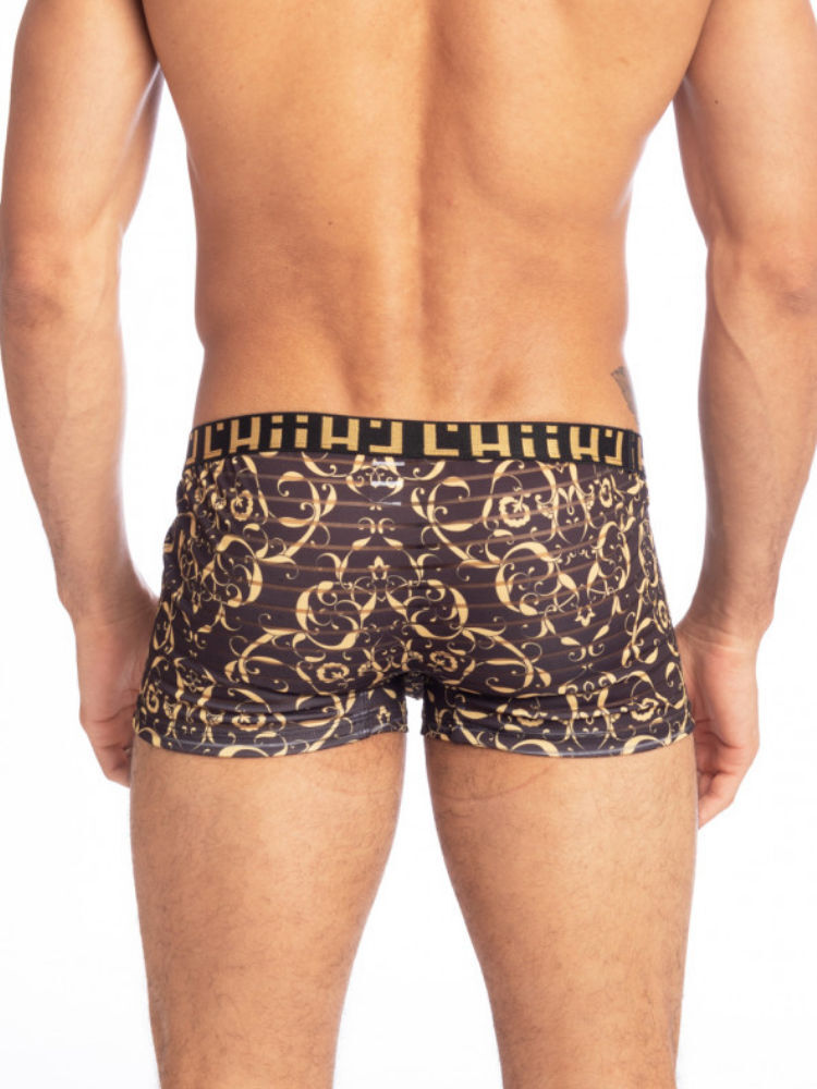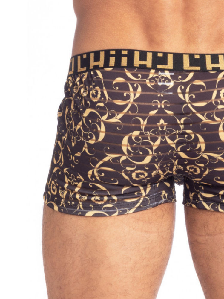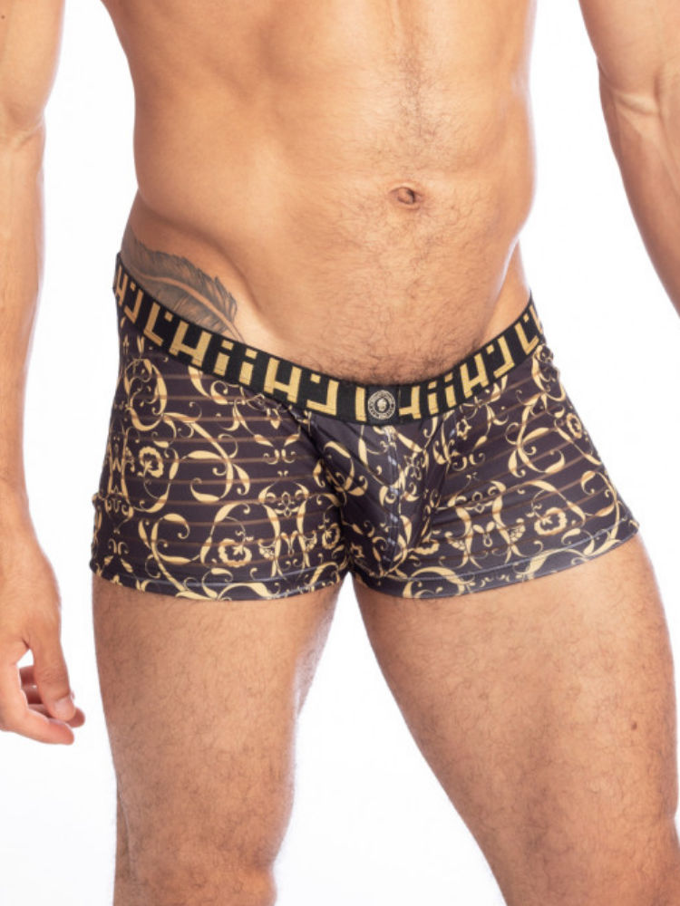 De nieuwe L’Homme Invisible Oppulence Oro Hipster Push-Up is een boxershort uitgevoerd in zwart met goud bedrukt en mesh.