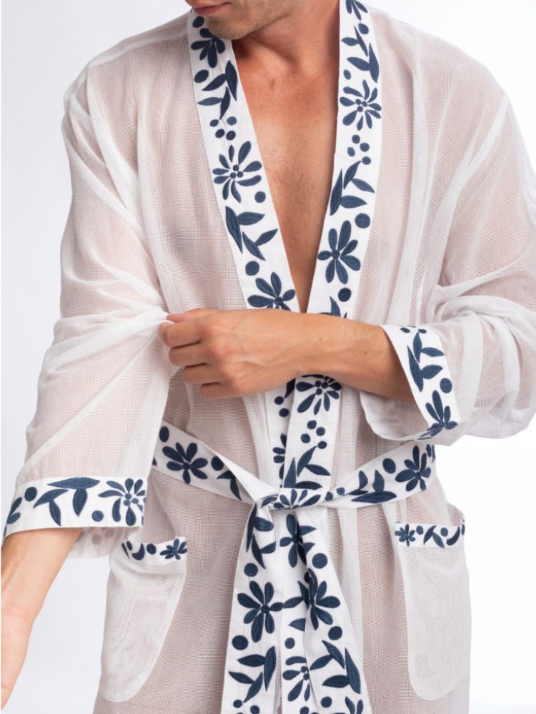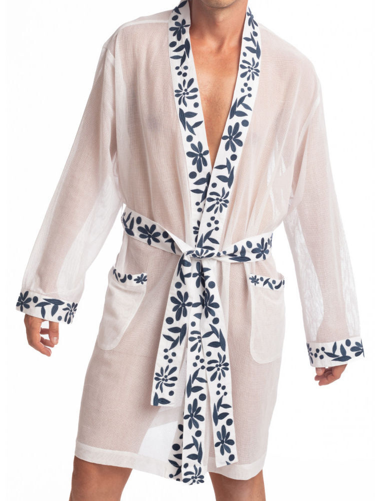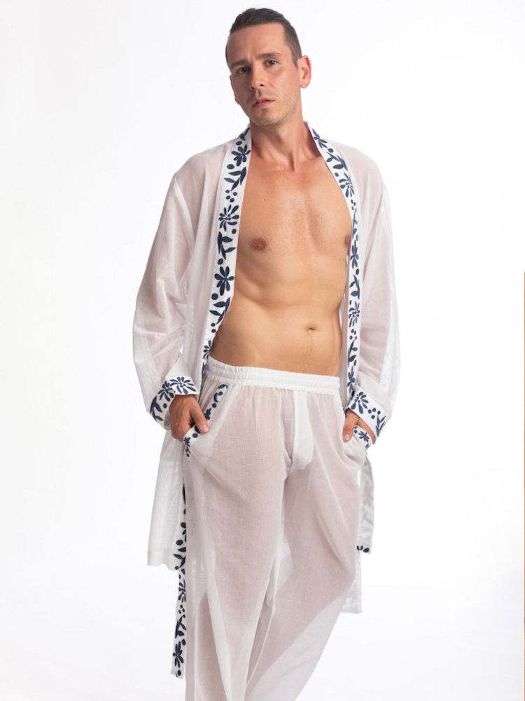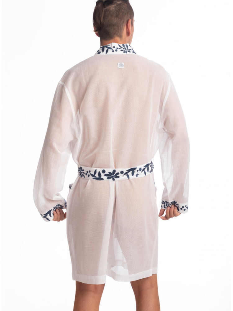 Deze luchtige Kimono is uitermate geschikt voor bij het zwembad, op het strand of om thuis in te relaxen. De L’Homme Invisible Santorini serie is gemaakt van een fijne, licht doorschijnende witte gaaskatoen en voorzien van borduursel in donkerblauw. Eenvoudig et combineren met je favoriete shirt of tank top, of zonder iets voor een uitgesproken, ondeugende look.