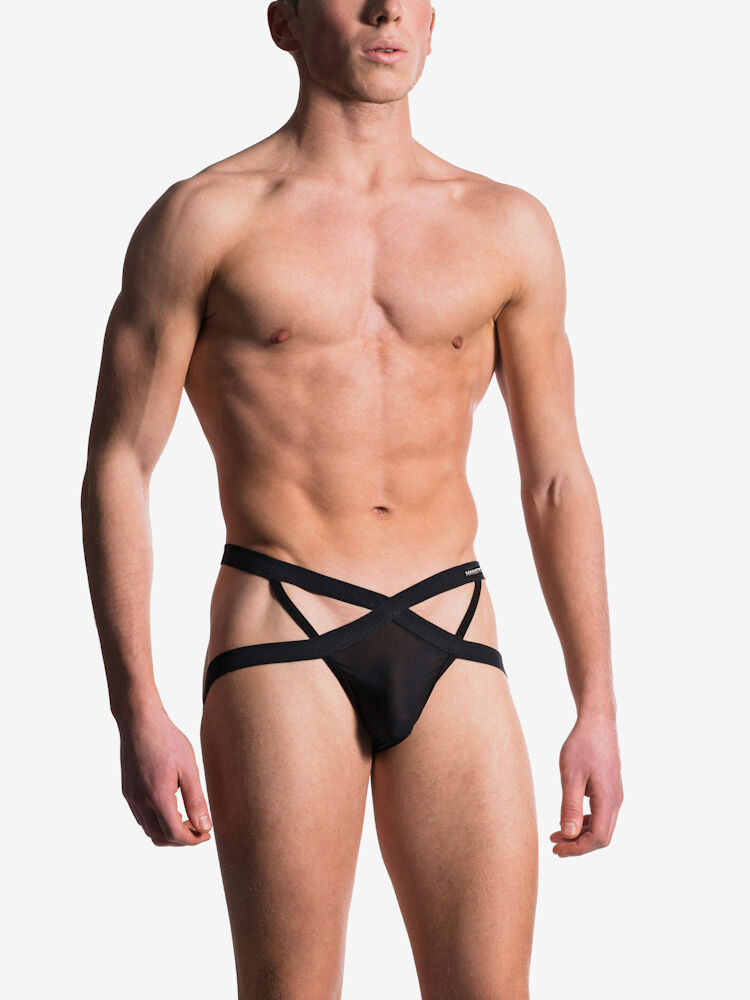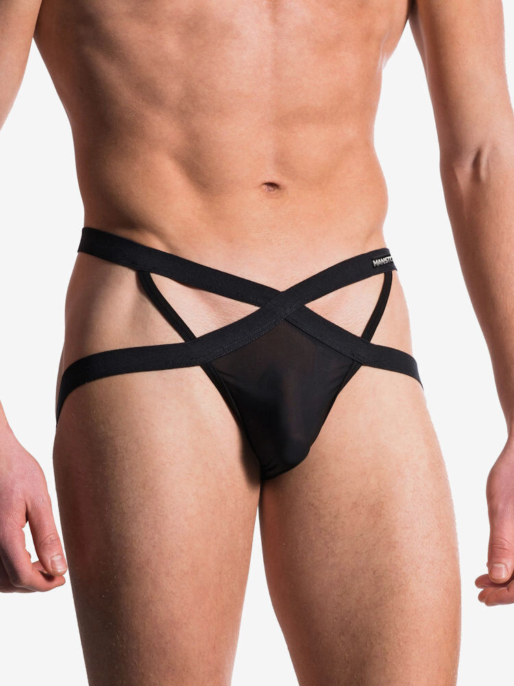 Manstore M101 X-Cut Jock 206190 jockstrap met gekruiste straps en openingen in zwart