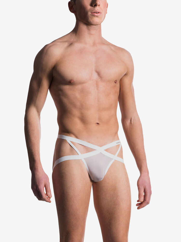 Manstore M101 X-Cut Jock jockstrap met gekruiste straps en openingen voor in wit