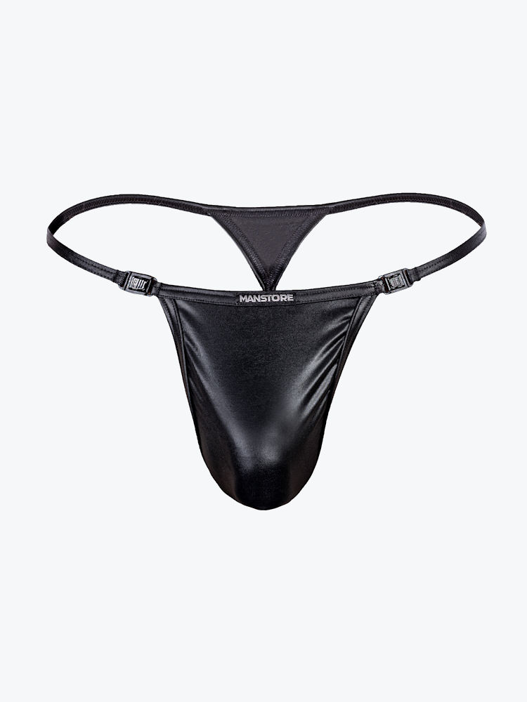 Manstore M107 stripper string met smalle bandjes en clips van dunne glimmende stretch