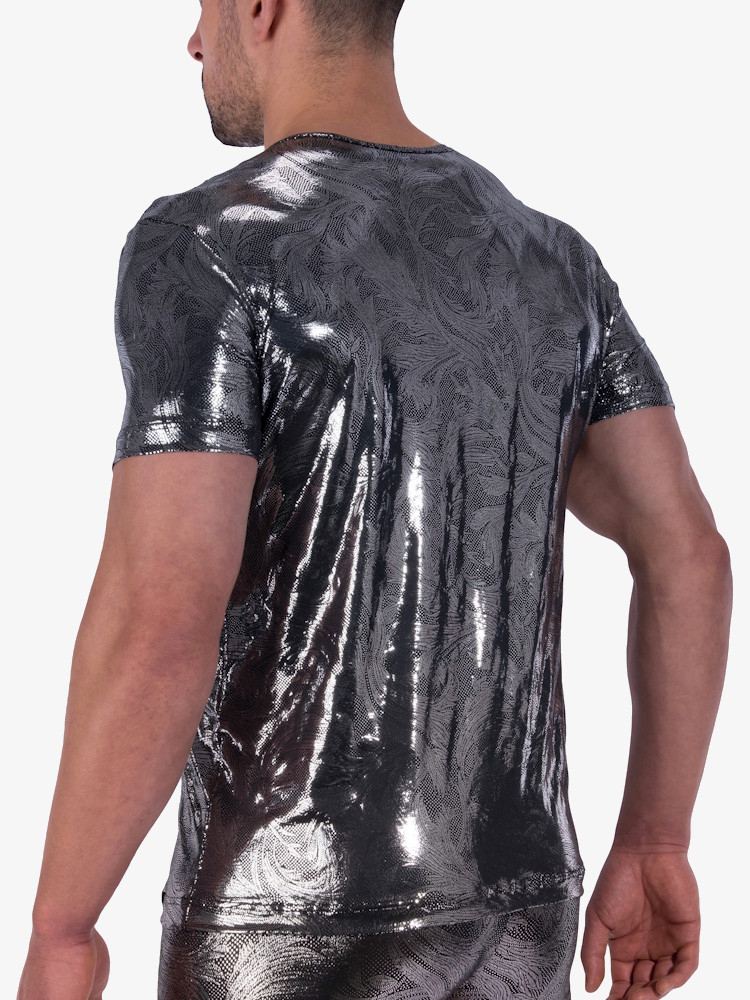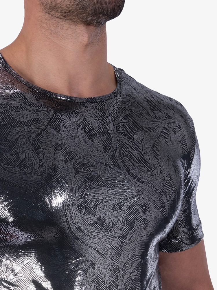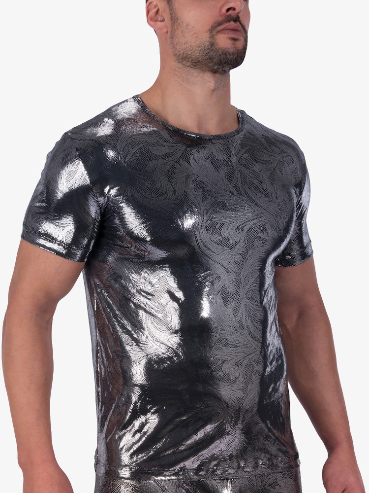 Ontdek de oogverblindende Manstore M2323 Casual Tee 212296 Black Silver en geniet van de soepele stretch, relaxte pasvorm en de glimmende afwerking. Vanwege de licht doorschijnende zwarte stof met rijkelijk versierd zilverkleurig dessin heb je met dit schitterende t-shirt geen reden meer nodig voor een feestje. Jij BENT het feestje!