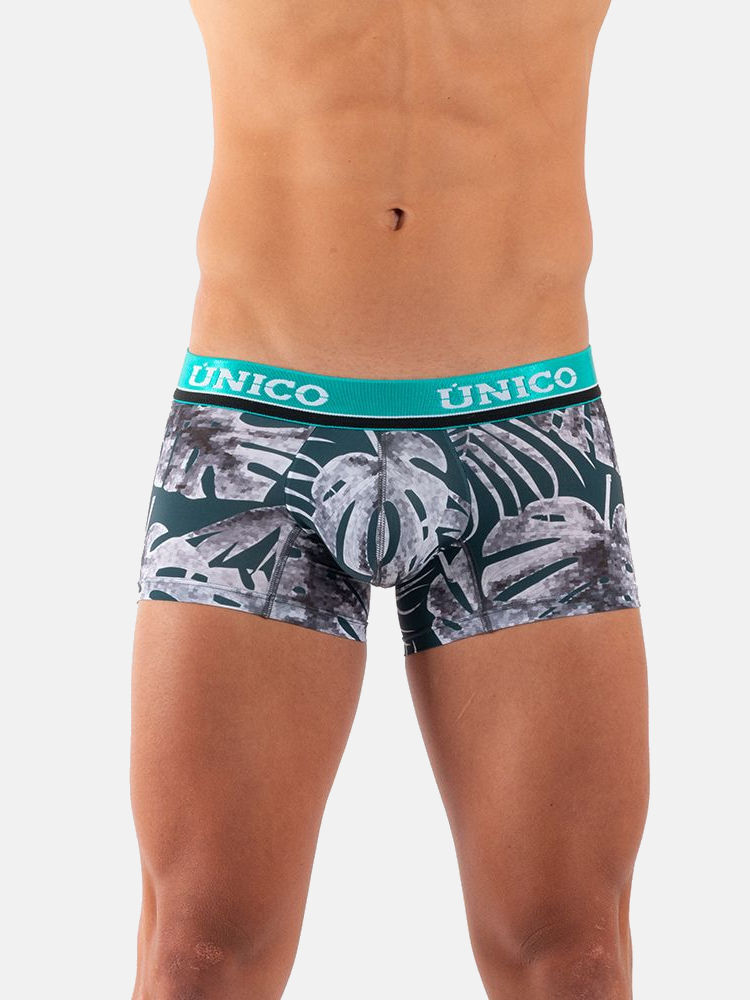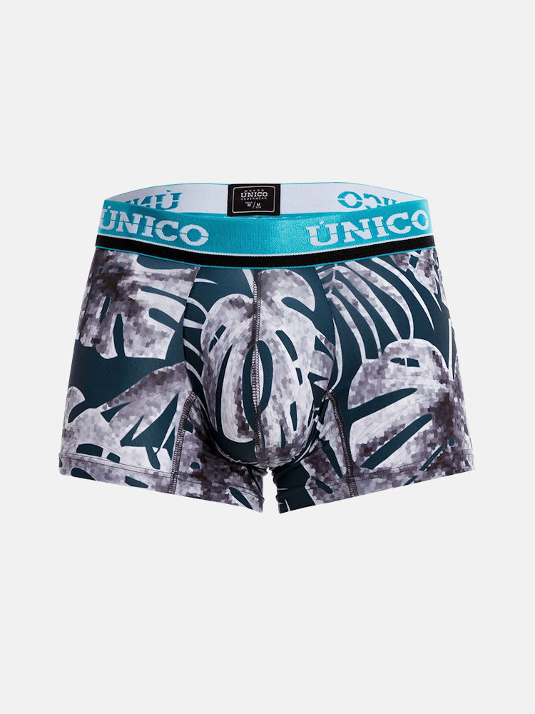 Latijns-Amerikaanse vrolijkheid, draagcomfort, hoogwaardige kwaliteit én een pouch voorkant die zorgt voor goede ondersteuning en een liftend effect. Ook de Mundo Unico Boxer Copa Corto Fresco Natural biedt jou deze unieke eigenschappen. De perfecte pasvorm van de korte boxershort zorgt dat deze aansluit op het lichaam en biedt goede ondersteuning tijdens het dragen. Uitgevoerd in een zachte, soepele stretch kwaliteit met plantendessin in petrol en grijstinten voor een rijke, natuurlijke look. Afgezet met aquablauwe logo tailleband.