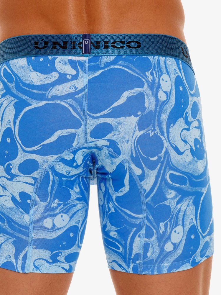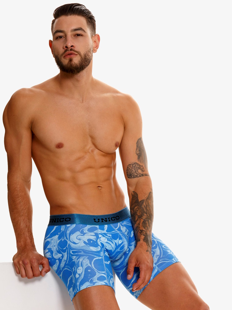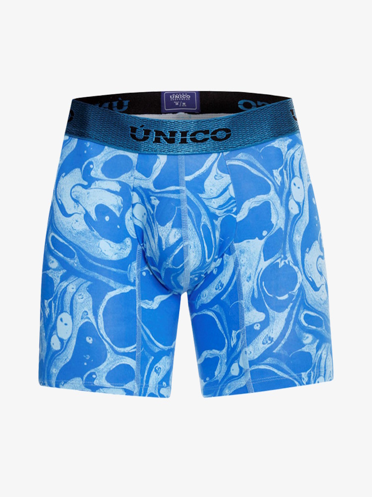 Voeg kleur toe aan je garderobe met de coole en vrolijke Mundo Unico Boxer Medio Oleina. Een lange strakke boxershort met pouch inzet van zeer dunne, soepele microfiber met abstracte olievlekken-print in blauwtinten.