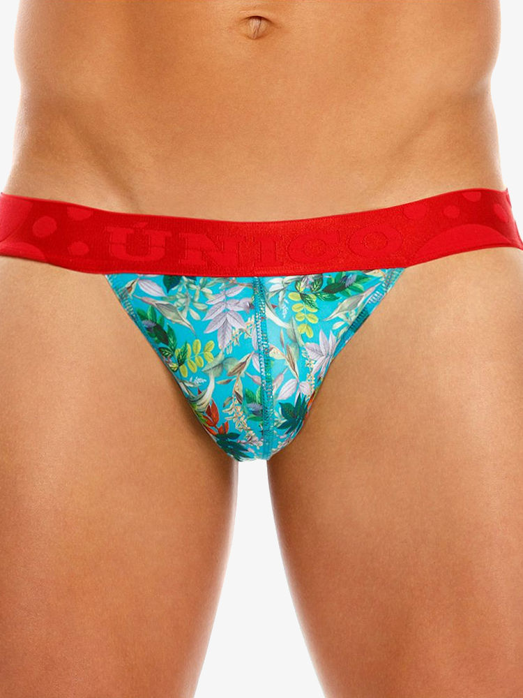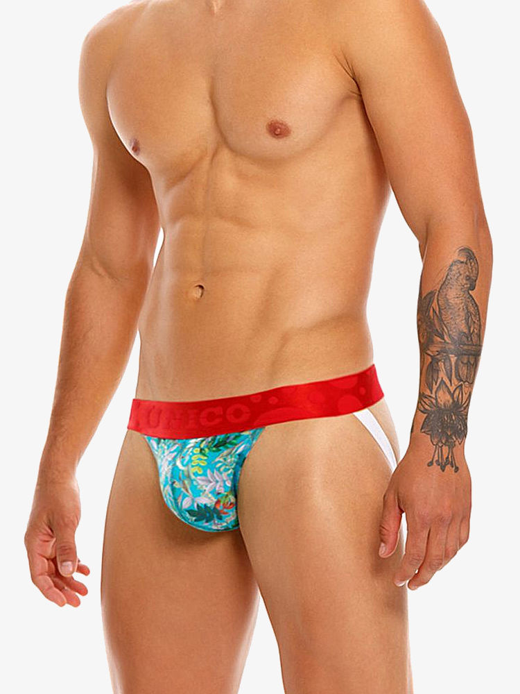 Gemaakt van een zachte microfiber kwaliteit en afgezet met een extra brede comfortabele elastische tailleband met Unico logo. De bij het kruis goed aansluitende pouch heeft voldoende ruimte en zorgt voor goede ondersteuning tijdens het dragen, én een natuurlijk liftend effect. De tropische print geeft de jockstrap een modernkarakter. Voorzien van twee zachte elastische straps onder de billen. Ervaar het luxe en vrije gevoel, en voel je zeker met deze stretch jockstrap uit de collectie van Mundo Unico Underwear.