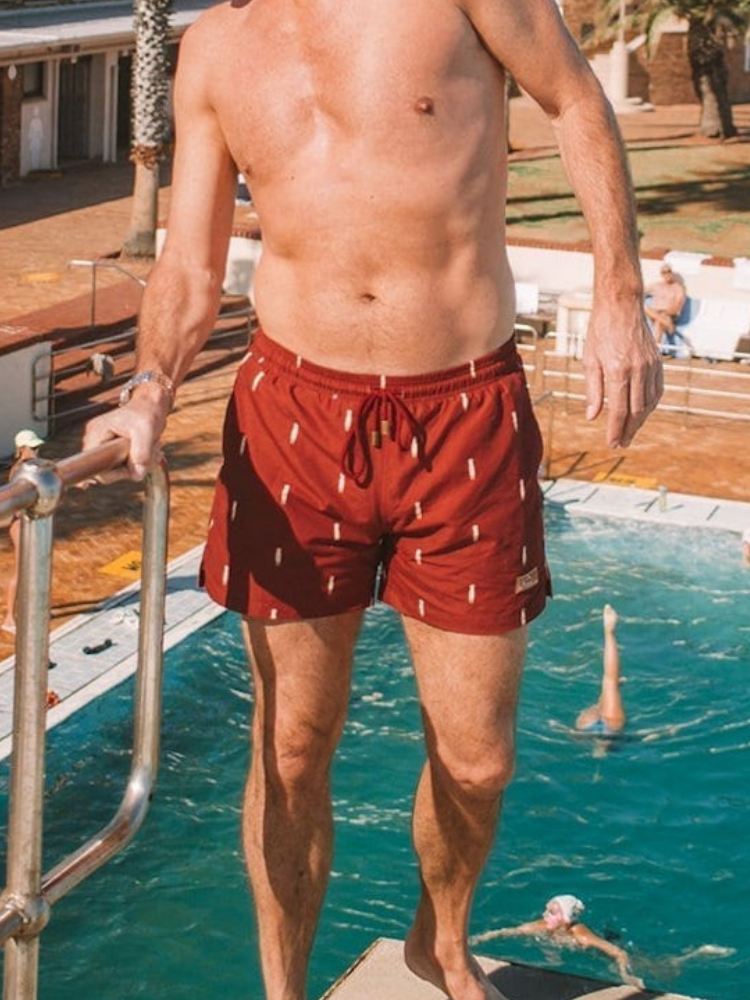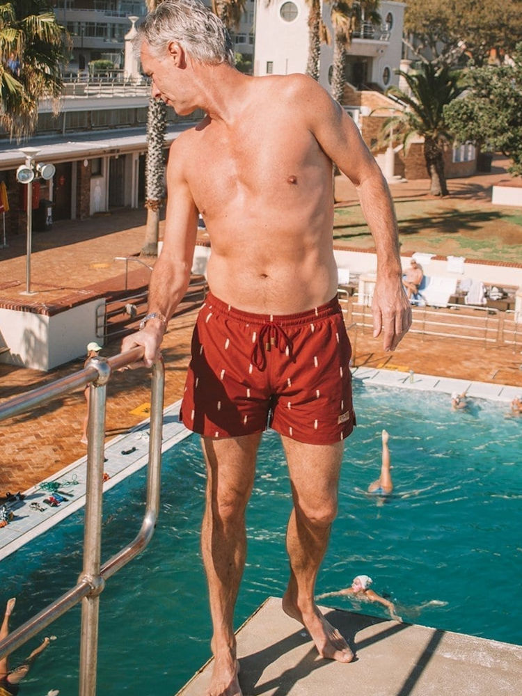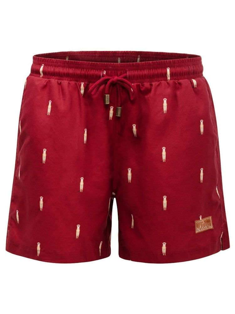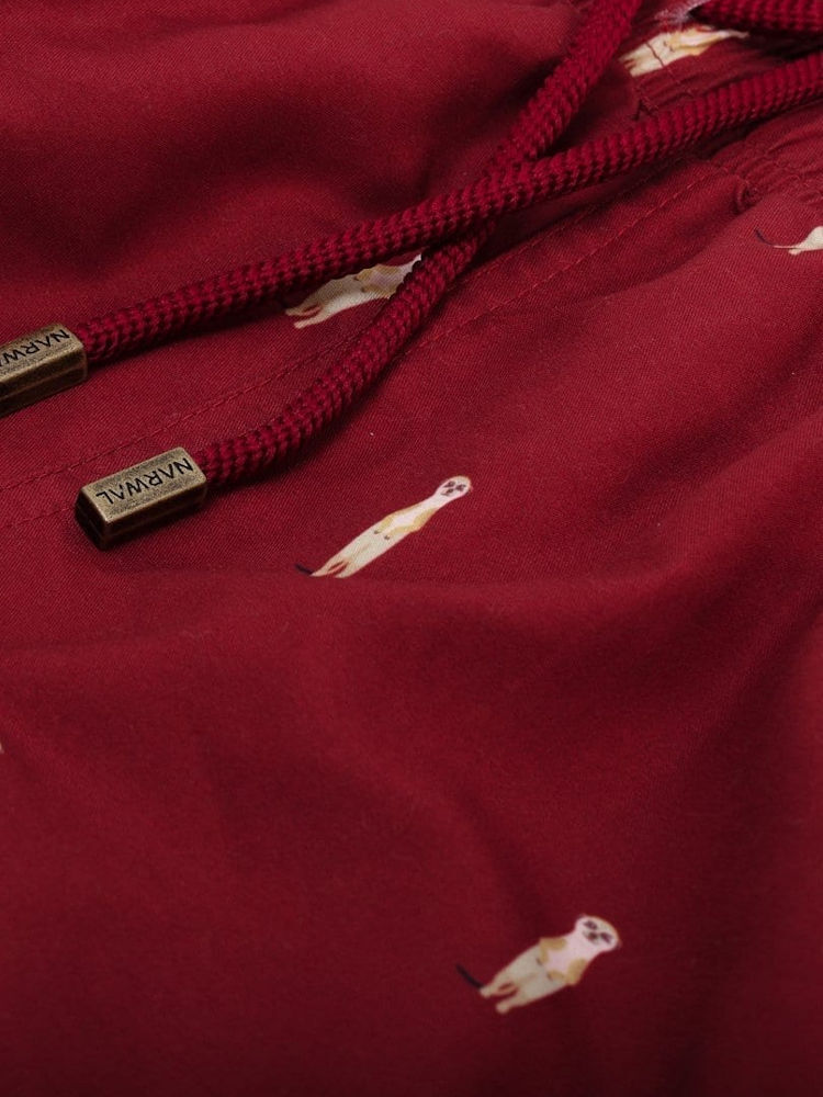 Narwal zwemshort van recycled polyester in wijnkleur met ‘stokstaartjes’-print