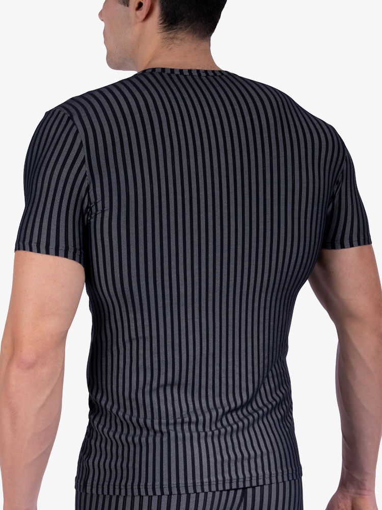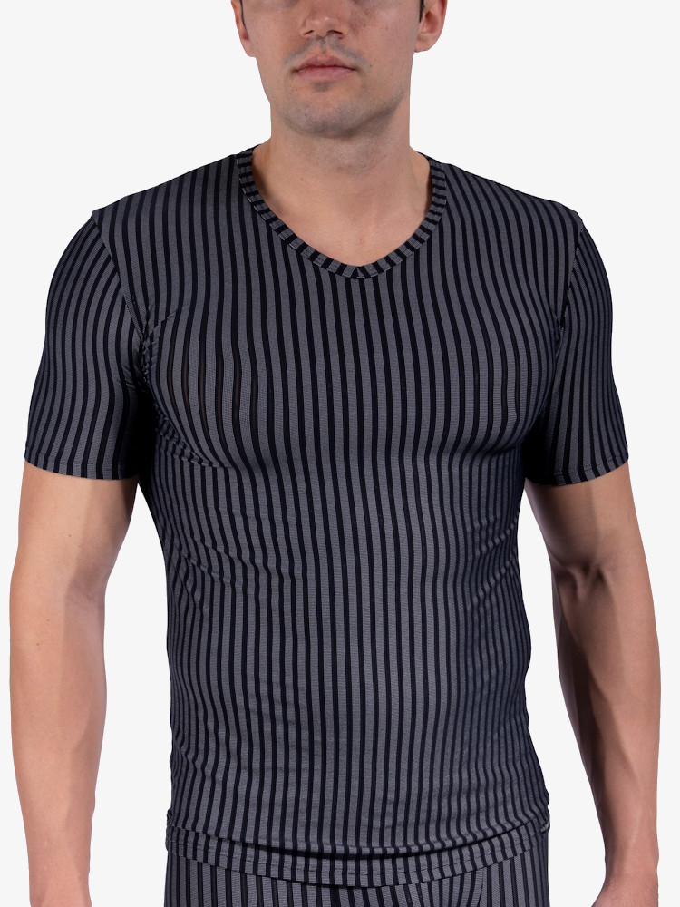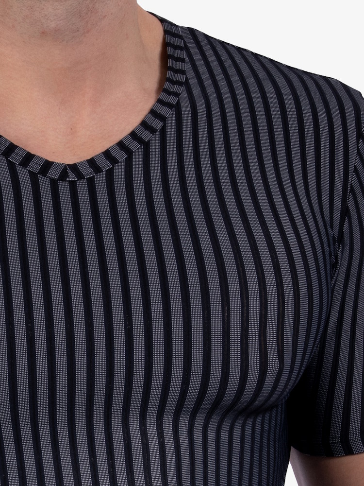 Maak kennis met de Olaf Benz RED2311 V-Neck Regular 109309 Rail en ervaar de luxe eigenschappen die kenmerkend zijn voor Olaf Benz ondergoed. Dit moderne shirt met v-hals is gemaakt van van soepele zilverkleurige stretch, afgewisseld met licht doorschijnend streeppatroon in zwart. Speciaal ontworpen voor alle shorty-dragers en Olaf Benz underwear fans. Stijlvol en spannend.