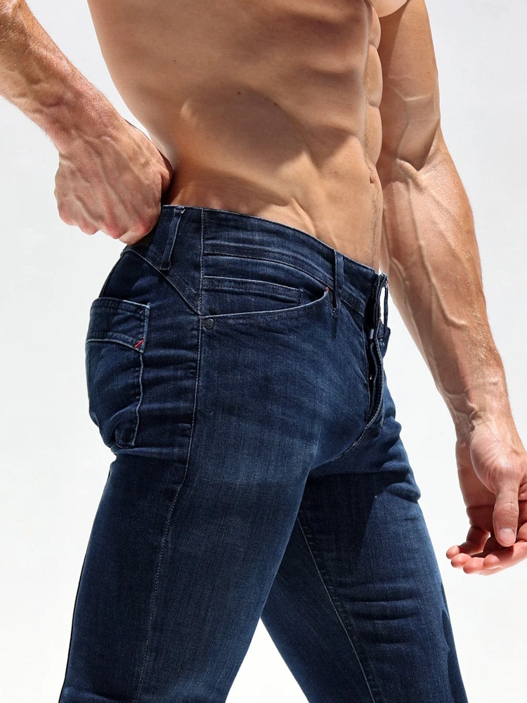 Rufskin Reed Dark Distressed Stretch Jeans stretch-katoen denim broek in diep blauw
