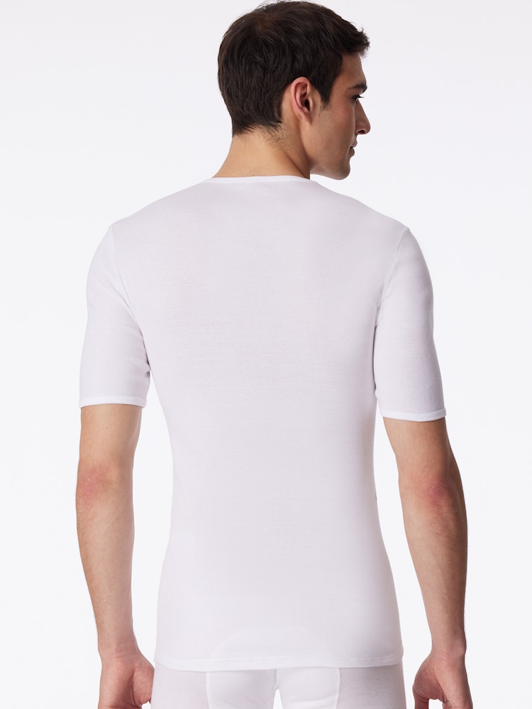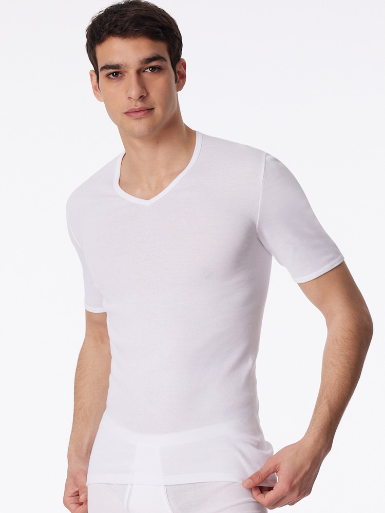 Super praktisch en comfortabel! Met het Schiesser V-Neck Shirt Fine Rib 005123100 White combineer je comfort met een uitgesproken sportieve look. Draag dit shirt met v-hals om te sporten, of onder een overhemd of trui voor een bijna niet-zichtbare look. Combineer het shirt met je favoriete jeans of short en creëer een stoere outfit. De langere achterkant geeft nog meer comfort en zorgt dat het shirt netjes blijft zitten.