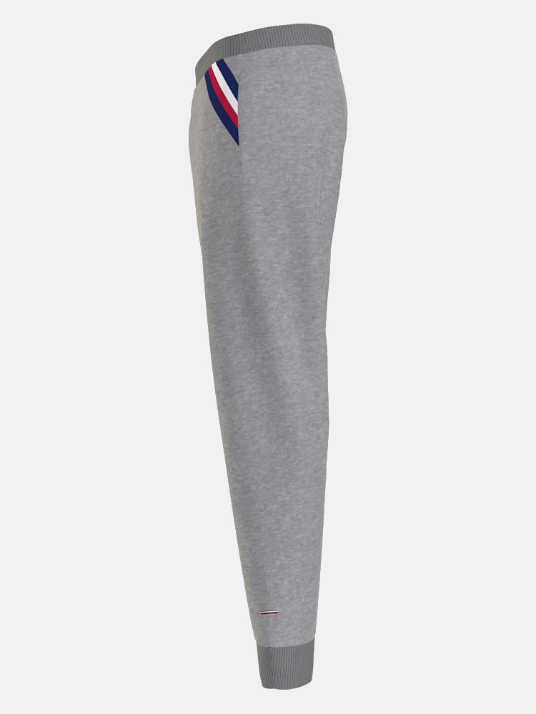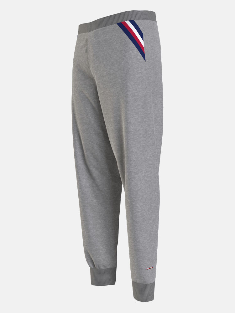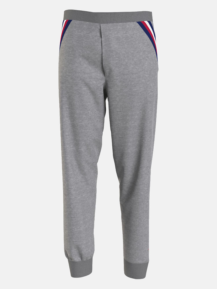 Goed om in te ontspannen en te slapen; deze Tommy Hilfiger sweatpant met gerecycled katoen in lichtgrijs en sportieve accenten in rood, wit en blauw.